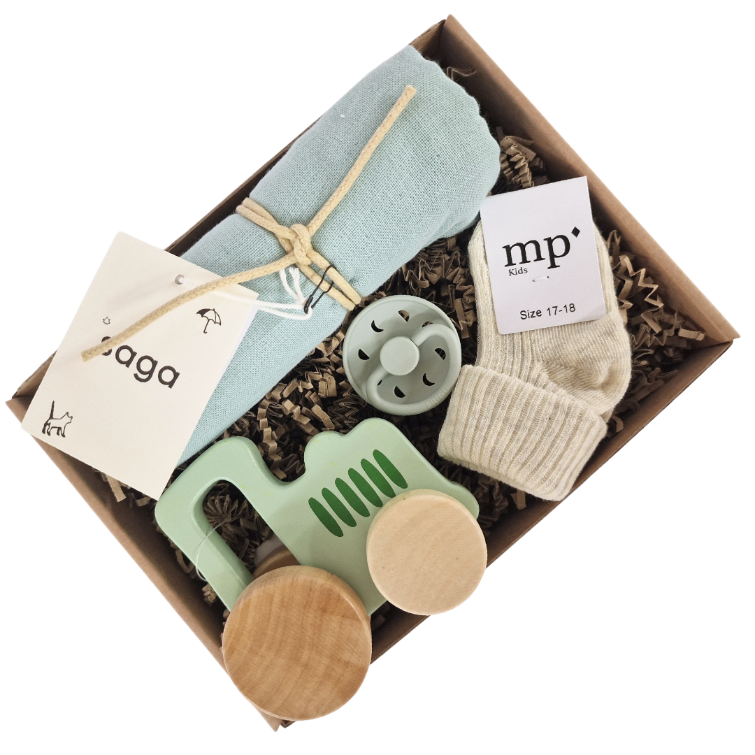 Send en sød hilsen til den nybagte familie med et ønske om stort tillykke. I gaven finder du nøje udvalgte produkter fra de bedste producenter samt en lille grøn traktor som den lille nye kan lege med. Gaveløsningen indeholder: Stofble fra saga babystrømp, Barselsgave | Baby Playtime.