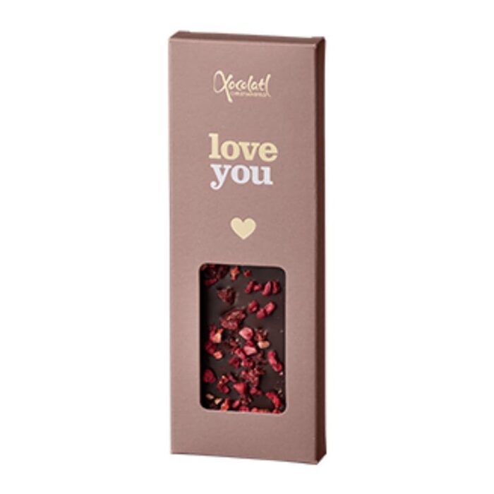 Lækker chokoladebar med 70 % mørk chokolade med røde bær. Chokoladebaren er i flot emballage, hvor der står ‘Love you’ på æsken. 50 g., Chokoladebar | Love you.