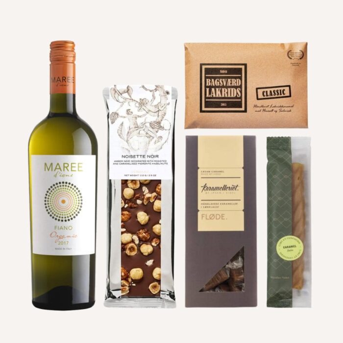 En flot firmagave til medarbejder, der indeholder alt, hvad hjertet begærer, bl.a. en god hvidvin og eksklusiv chokolade og lækre karameller fra Karamelleriet., Firmagave | Tillykke.