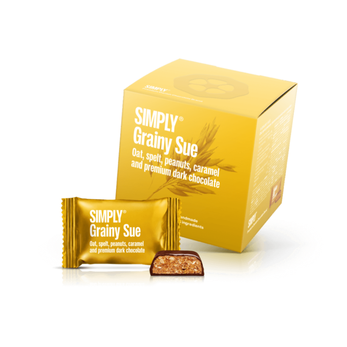 Tænk guldmedaljeHjemmerørt base af karamel, peanuts, spelt og havre overtrukket med premium mørk chokolade. Den mørke chokoladeskal i kombination med et blødt, let sejt indre giver Sue en førsteplads i rigtig manges hjerter. En Cube består af 9 stk. Grain, Grainy Sue – Cube med bites | Havre, spelt, karamel, peanuts og mørk chokolade.