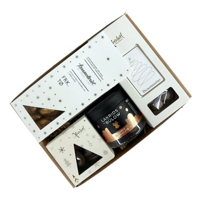 En julegave som helt sikkert vil bringe glæde hos modtageren. Fyldt med julelækkerier. Gaveløsningen indeholder: Hasselnødder med nougat Karameller med passionsfrugt og hvid chokolade Chokolade poletter fra Xocolatl Double Chocolate lakridskugler fra Lakr, Julegave | Med lækker chokolade og karameller.