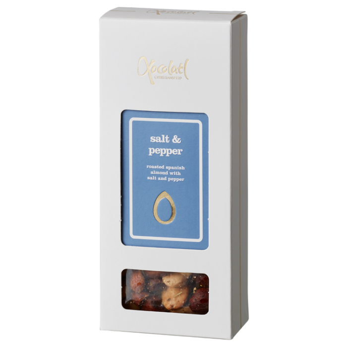 Klassisk kombi – Sprød og pikant Ristede spanske mandler med salt og peber smag. Hvis du elsker smagen af mandler og salt/peber, så er disse mandler et fantastisk valg. Denne kombination giver en lækker oplevelse, perfekt som snack til tapas eller bare fo, Mandler med salt og pebersmag fra Xocolatl.