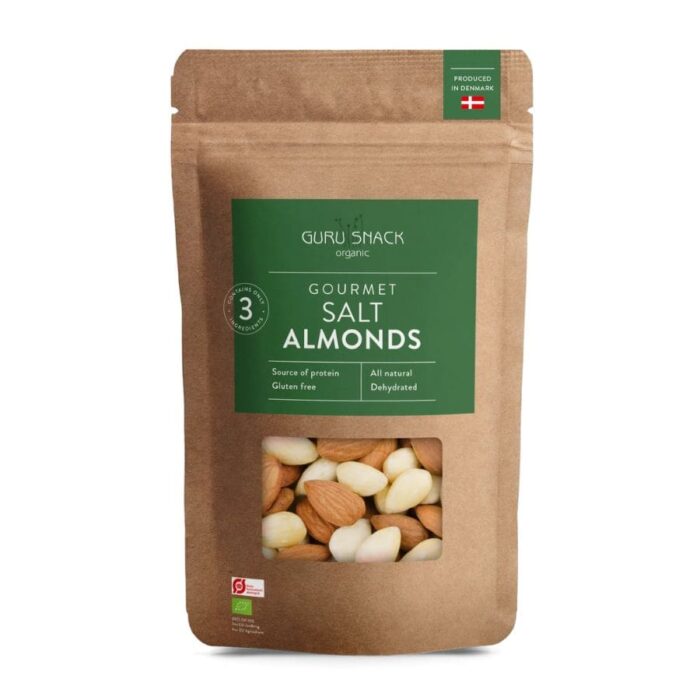 Guru Snack’s Gourmet Salt Almonds er den perfekte snack til enhver lejlighed. Disse lækre mandler er en blanding af afskallede og blancherede mandler, der er ristet med havsalt og en smule økologisk solsikkeolie. 100 gram., Mandler | Salt.