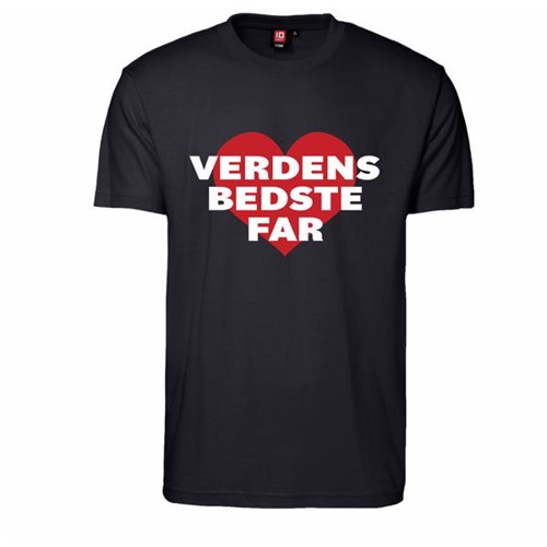 T-shirt med VERDENS BEDSTE FAR logo trykt i rød og hvidt på fronten.Klassisk T-shirt med rund hals, fire-lags halsrib og nakke- og skulderbånd. Holder faconen vask efter vask.En rigtig god kvalitets T-shirt!Størrelsesguide:Størrelsesguiden er målt efter s, T-shirt – VERDENS BEDSTE FAR.