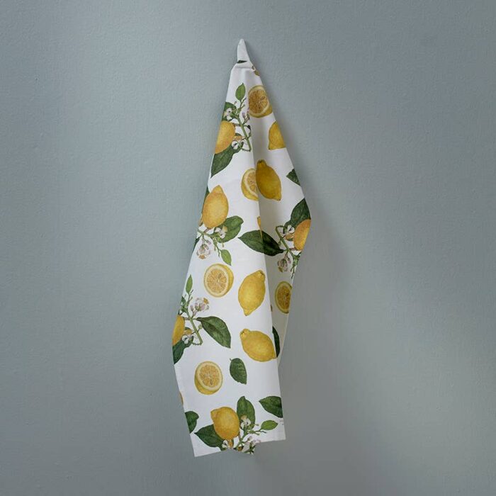 Smuk økologisk viskestykke lavet i Europa af 100% organisk bomuld. Med motiv af de sommerlige citroner. Produktet er enkeltpakket og leveres i bionedbrydelig cellofan. • Dimensioner: 48×70 cm. • Materiale: 100% økologisk bomuld • Rem til op, Viskestykke | Citroner | økologisk bomuld.